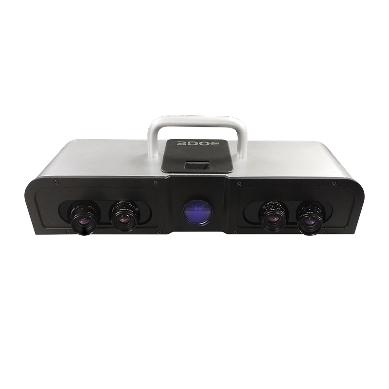 The 3DOE 3D measuring head is composed of two high-resolution industrial CCD cameras on the left and right and a grating projection unit. The structured light measurement method is used to project a group of grating fringes with phase information onto the surface of the measured object using the grating projection unit. The two cameras on the left and right can measure simultaneously, and combine computer vision technology, photoelectric sensor technology, image processing technology and software control technology to obtain high-density three-dimensional data on the surface of the object in a very short time. The rotating object or scanning head is used to change the scanning angle of view. Based on the automatic splicing technology of multi-view point cloud, it can complete 360° scanning of the object in all directions.